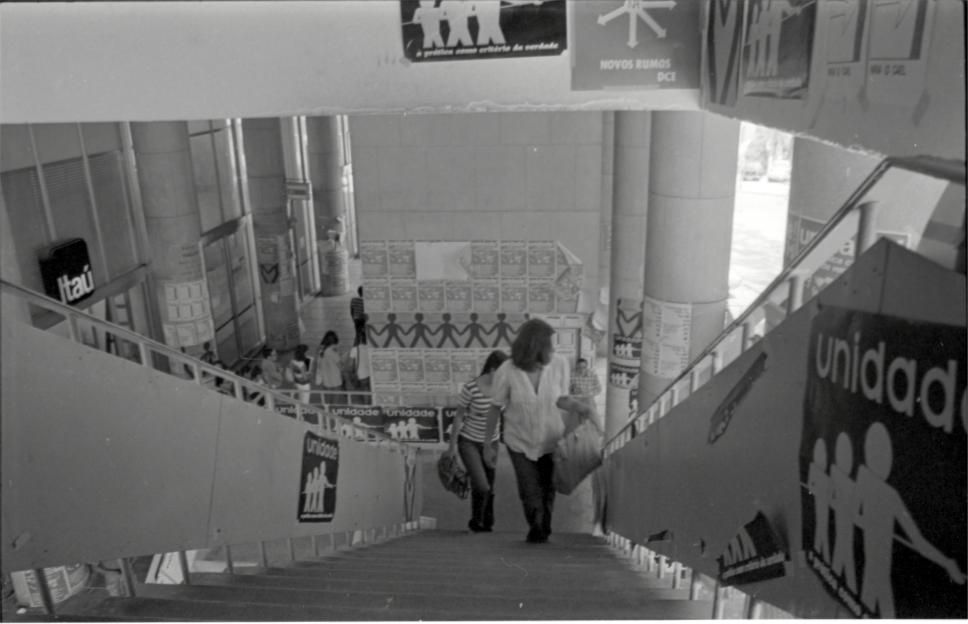 Vista da escadaria da ala Frings com cartazes afixados das chapas concorrentes ao DCE.