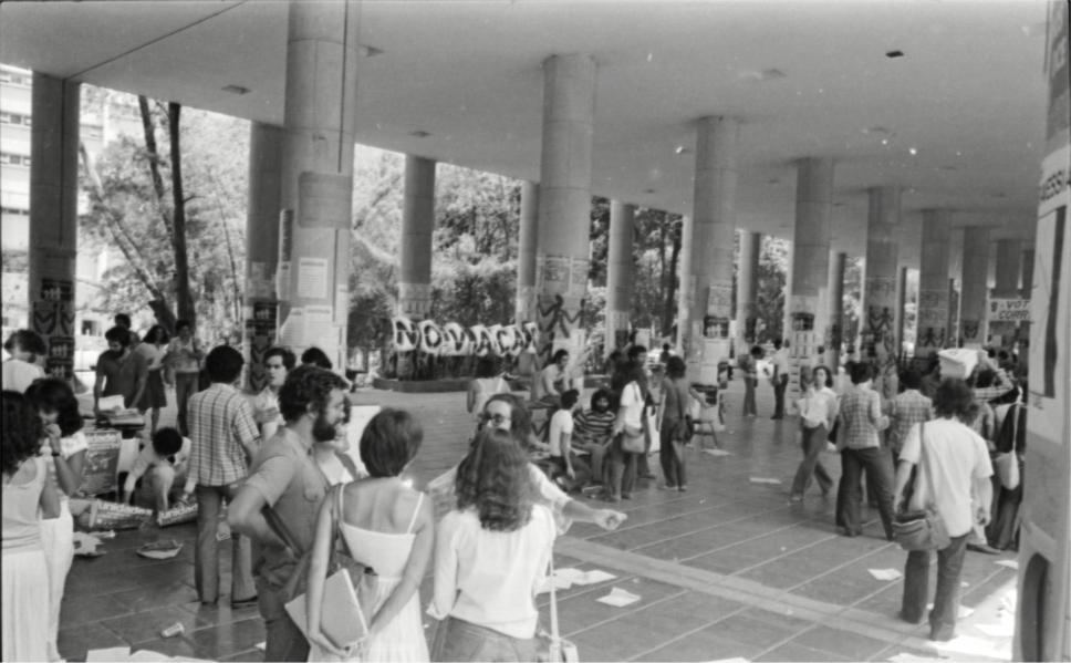 Pilotis movimentado por alunos, com faixas e cartazes das chapas que concorrem ao DCE. Chapas Novação, Travessia, entre outras.
