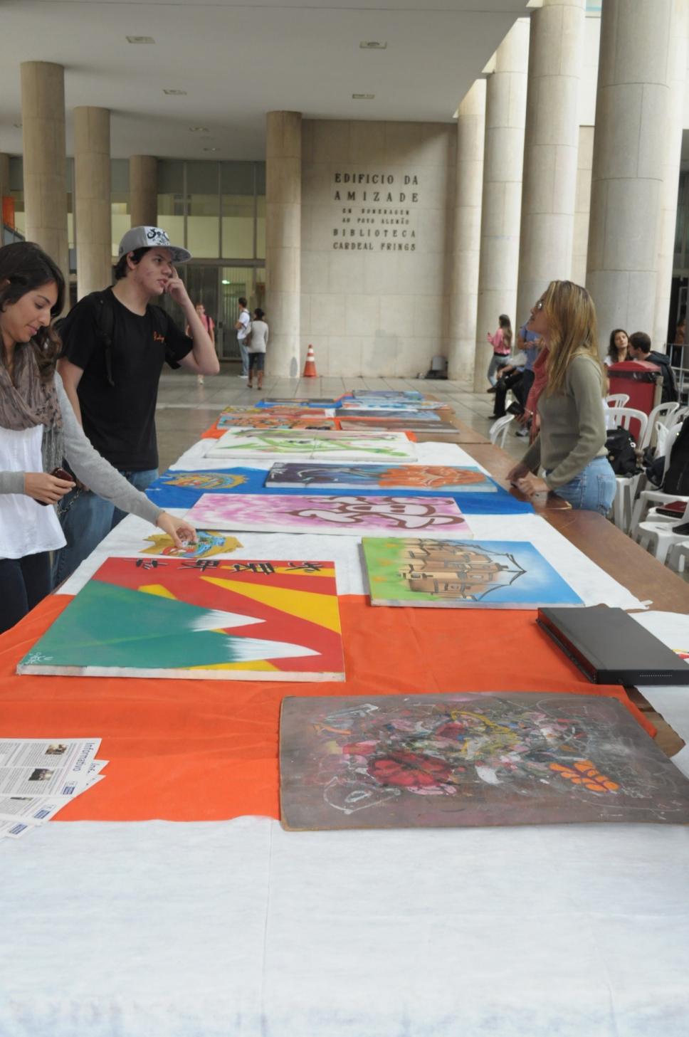 Mesa expositiva com as artes feitas pelos moradores da Maré.