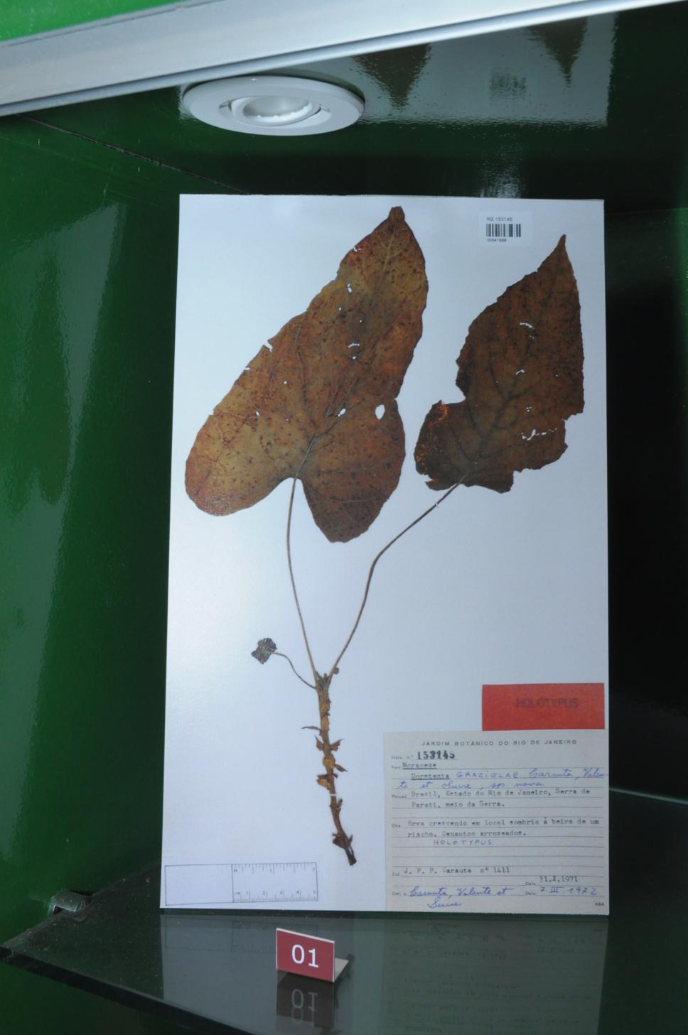 Fac-símile de um exemplar typus da espécie Dorstenia grazielae Carauta, dedicada à Dra. Graziela. Estante "Dra. Graziela Maciel Barroso, cientista e mestra".