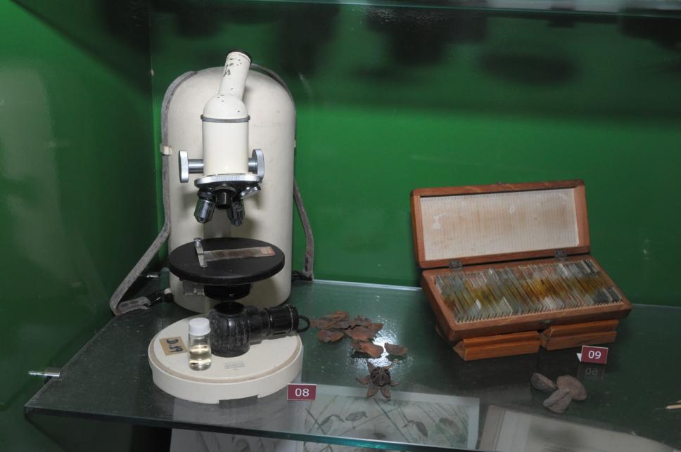 Microscópio portátil Wild Heerbrugg, modelo M11. c. 1960. Acervo Departamento de Botânica do Instituto de Biologia da UFRJ. Caixa de armazenamento de lâminas permanentes com cortes anatômicos. Acervo Pe. Josafá Carlos de Siqueira S.J. Estante "O fazer científico"