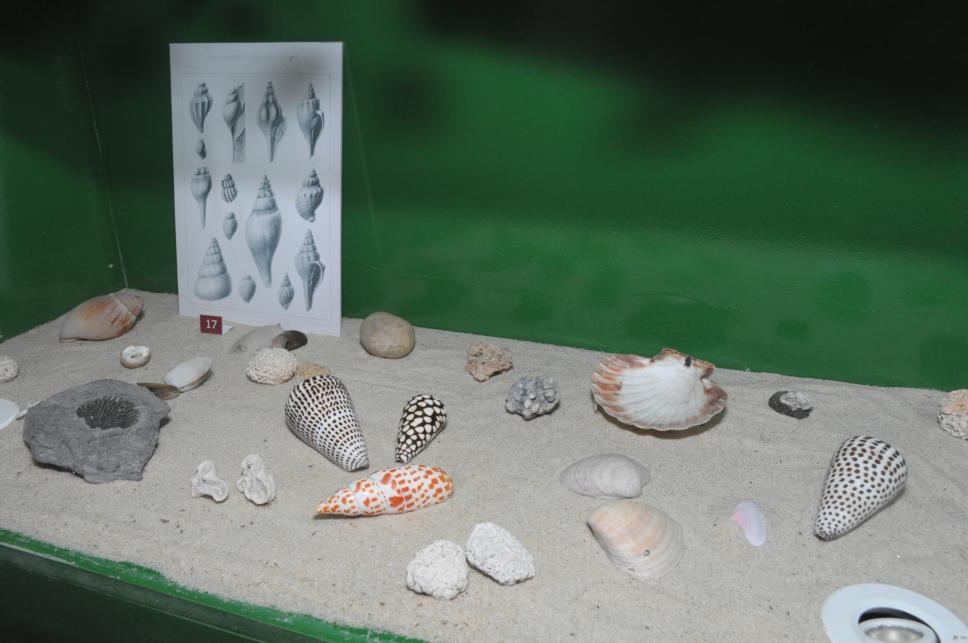 Conchas e pedras que forram o chão da vitrine. Estantes "O fazer científico".