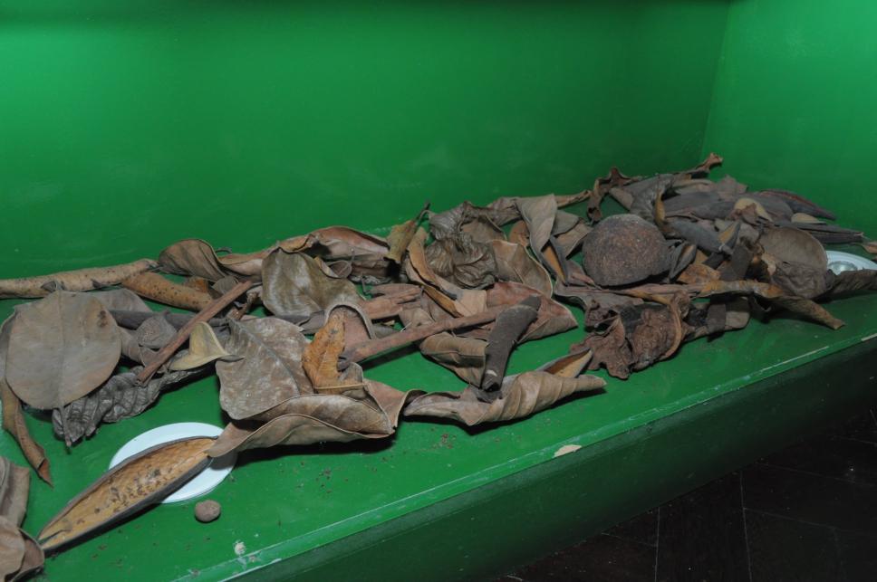 Folhas que forram o chão da vitrine. Estante "Dra. Graziela Maciel Barroso, cientista e mestra".