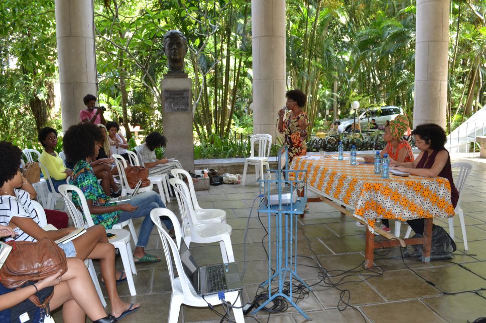 Na mesa da esq. para dir.: Claudete Alves (escritora e pesquisadora), Milena Manfredini (CIS) e prof. Janaína Damaceno (UERJ)