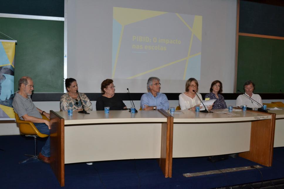 Na mesa da esq. para dir.: prof. Ilmar Rohloff de Mattos (HIS), n.i., Lígia Guedes (Diretora da Escola Municipal Christiano Hamann), prof. José Ricardo Bergmann (CETUC, Vice-Reitor para Assuntos Acadêmicos), profa. Maria Rita Passeri Salomão (EDU), profa. Daniela Trejos Vargas (JUR) e prof. Ralph Ings Bannell (EDU)