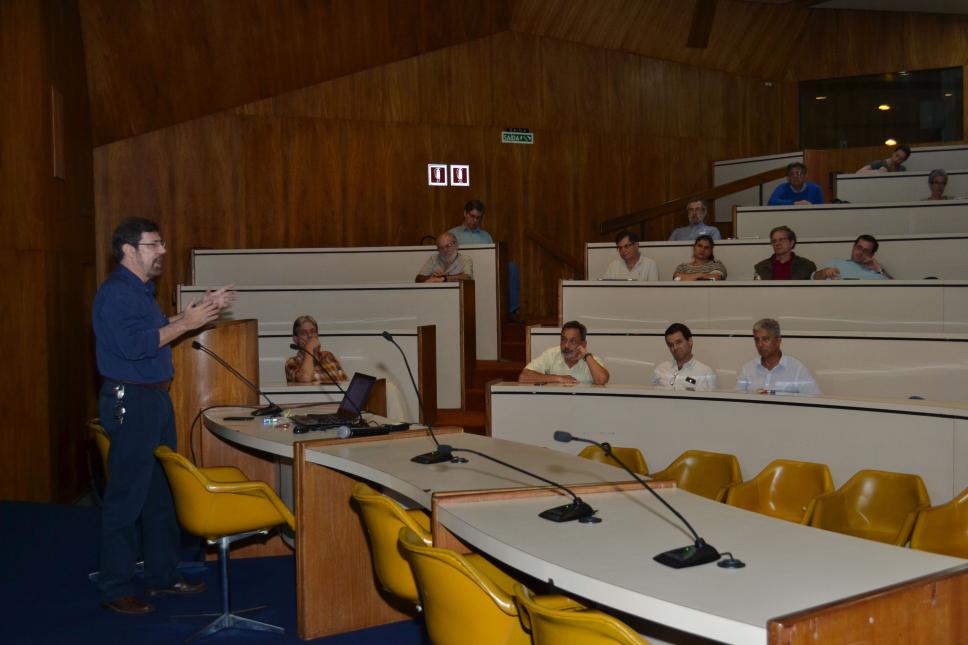 Prof. Luiz Alencar Reis da Silva Mello (CETUC, Decano do CTC) em pé na frente; na 1ª fila da esq. para dir.: prof. Ricardo Tanscheit (ELE), prof. Luiz Fernando Campos Ramos Martha (CIV), prof. Sidnei Paciornik (DEMA), n.i.