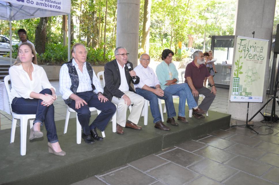Da esq. para dir.: Ingrid Gerolimich (Superintendente de Território e Cidadania), Carlos Minc (Secretário de Estado do Meio Ambiente do Rio de Janeiro), prof. pe. Josafá Carlos de Siqueira S.J. (BIO, Reitor), prof. Augusto Sampaio (COM, Vice-Reitor para Assuntos Comunitários), prof. Luiz Felipe Guanaes Rego (GEO, NIMA) e prof. Adair Leonardo Rocha (COM)