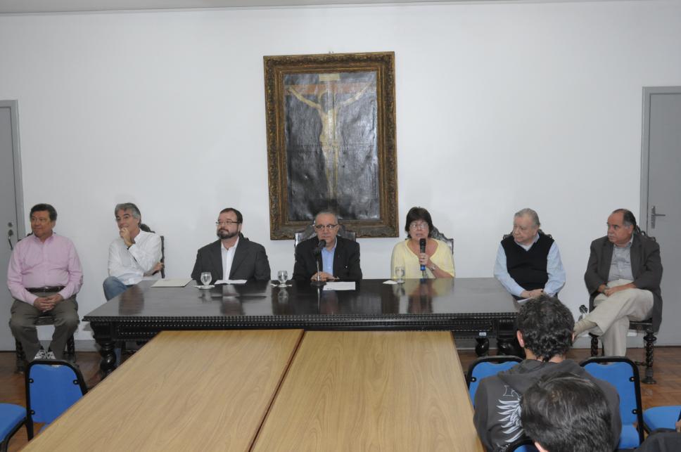 Da esq. para dir.: prof. Luiz Carlos Scavarda do Carmo (FIS, Vice-Reitor para Assuntos Administrativos), prof. José Ricardo Bergmann (CETUC, Vice-Reitor para Assuntos Acadêmicos), prof. Augusto César Pinheiro da Silva (GEO), prof. pe. Josafá Carlos de Siqueira S.J. (BIO, Reitor), profa. Regina Célia de Mattos (GEO), prof. pe. Francisco Ivern Simó S.J. (Vice-Reitor), prof. Luiz Roberto Azevedo Cunha (ECO, Decano CCS).
