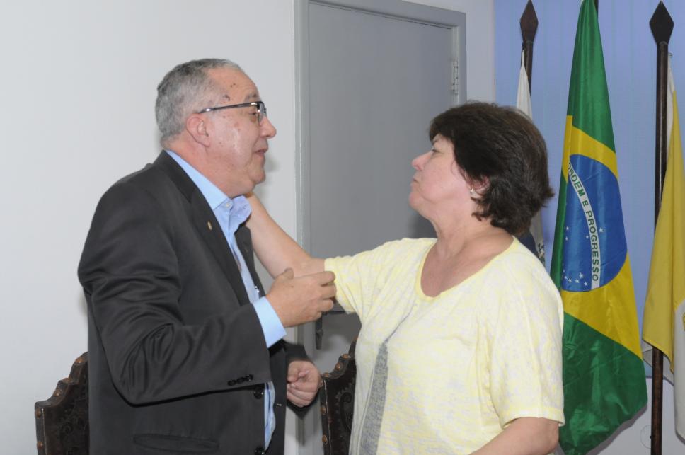 O Reitor Pe. Josafá S.J. e a profa. Regina Célia se cumprimentam na cerimônia de posse.