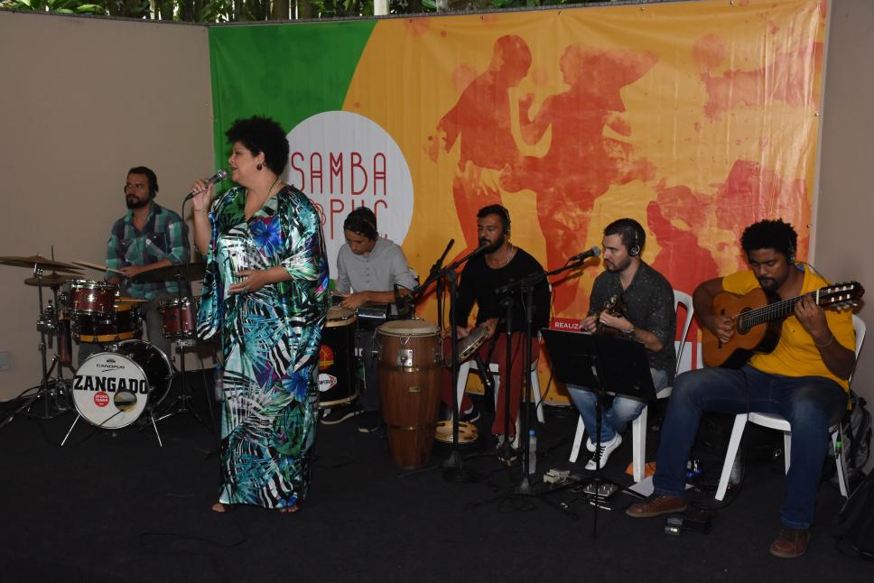 Fabiana Cozza e banda durante apresentação na roda de samba.