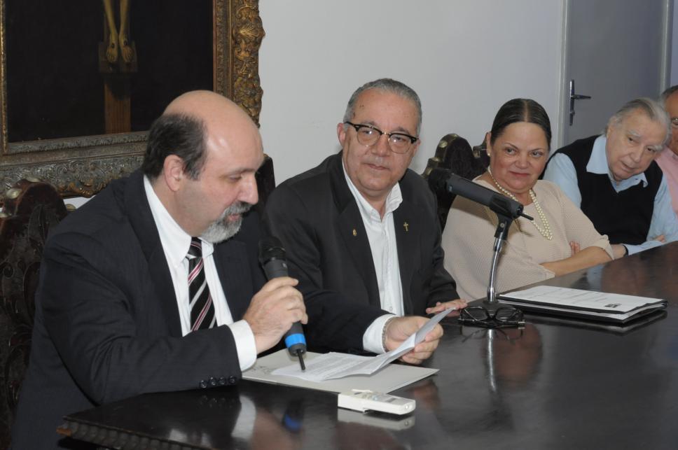 Da esq. para dir.: prof. Jesus Landeira-Fernandez (PSI), prof. pe. Josafá Carlos de Siqueira S.J. (BIO, Reitor), profa. Maria Elizabeth Ribeiro dos Santos (PSI), prof. pe. Francisco Ivern Simó S.J. (Vice-Reitor).