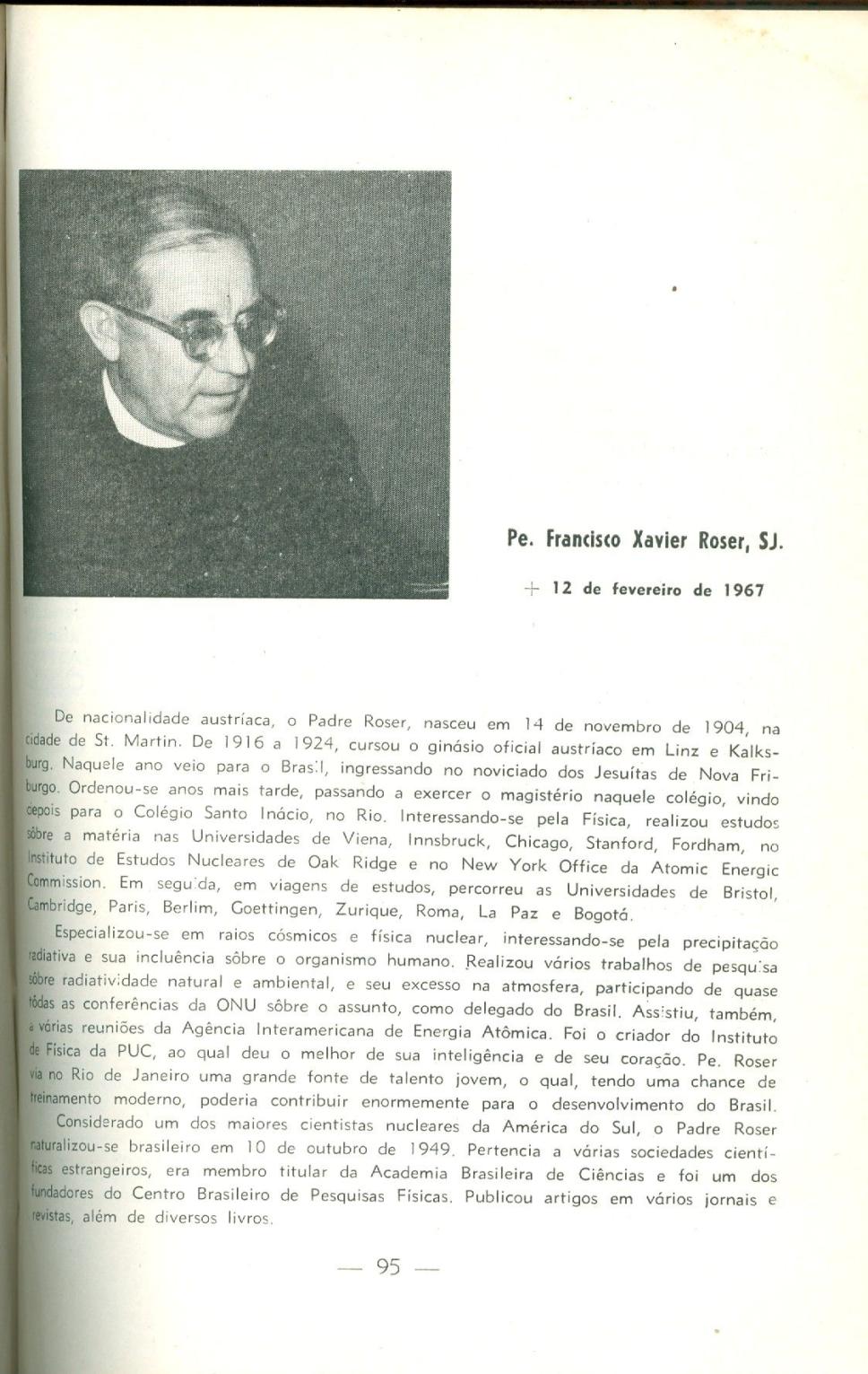 Pequena biografia em homenagem ao Pe.Francisco Xavier Roser, que falecera em 12 de fevereiro de 1967.