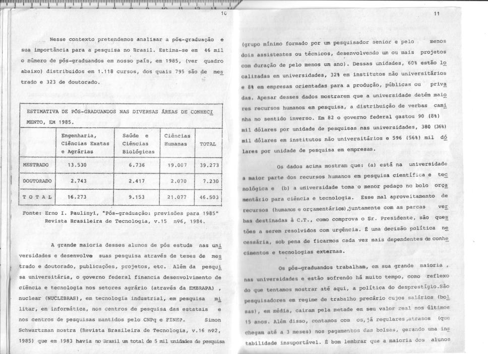 p.10 e 11 - Da pesquisa e pós-graduação no Brasil (cont.). Tabela com estimativa de pós-graduandos em 1985 no Brasil.