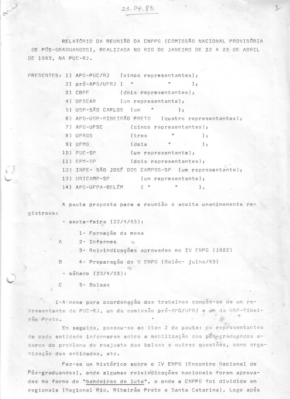 Pág. 1 - Relatório da Reunião da CNPPG (Comissão Nacional Provisória de Pós-Graduandos) realizada na PUC-Rio nos dias 22 e 23/04/1983. Representantes da PUC-Rio, UFRJ, CBPF, UFSCar, USP, UFSC, UFRGS, UFMG, PUC-SP, EPM-SP, INPE, Unicamp e UFPA. Na pauta, a preparação do V ENPG - Encontro Nacional de Pós-graduação, em Belém, em julho, e a questão das bolsas.