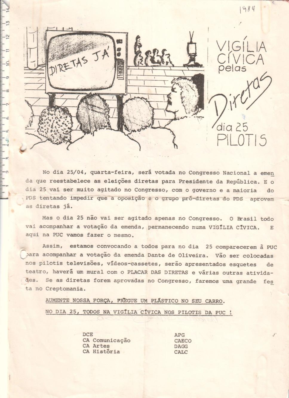 Convocação para manifestação que ocorreria nos pilotis no dia da votação da emenda constitucional que restabeleceria o voto direto para presidente. Assinado pelo DCE, APG, CAECO, DAGG, CALC e CAs de Comunicação, Artes e História. Ilustração com pessoas assistindo a TV nos pilotis.