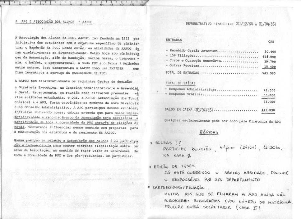 p.5 e 6 - A APG e a Associaçãod e Alunos (AAPUC). Demonstrativo financeiro 01/12/1984 a 01/04/1985.
