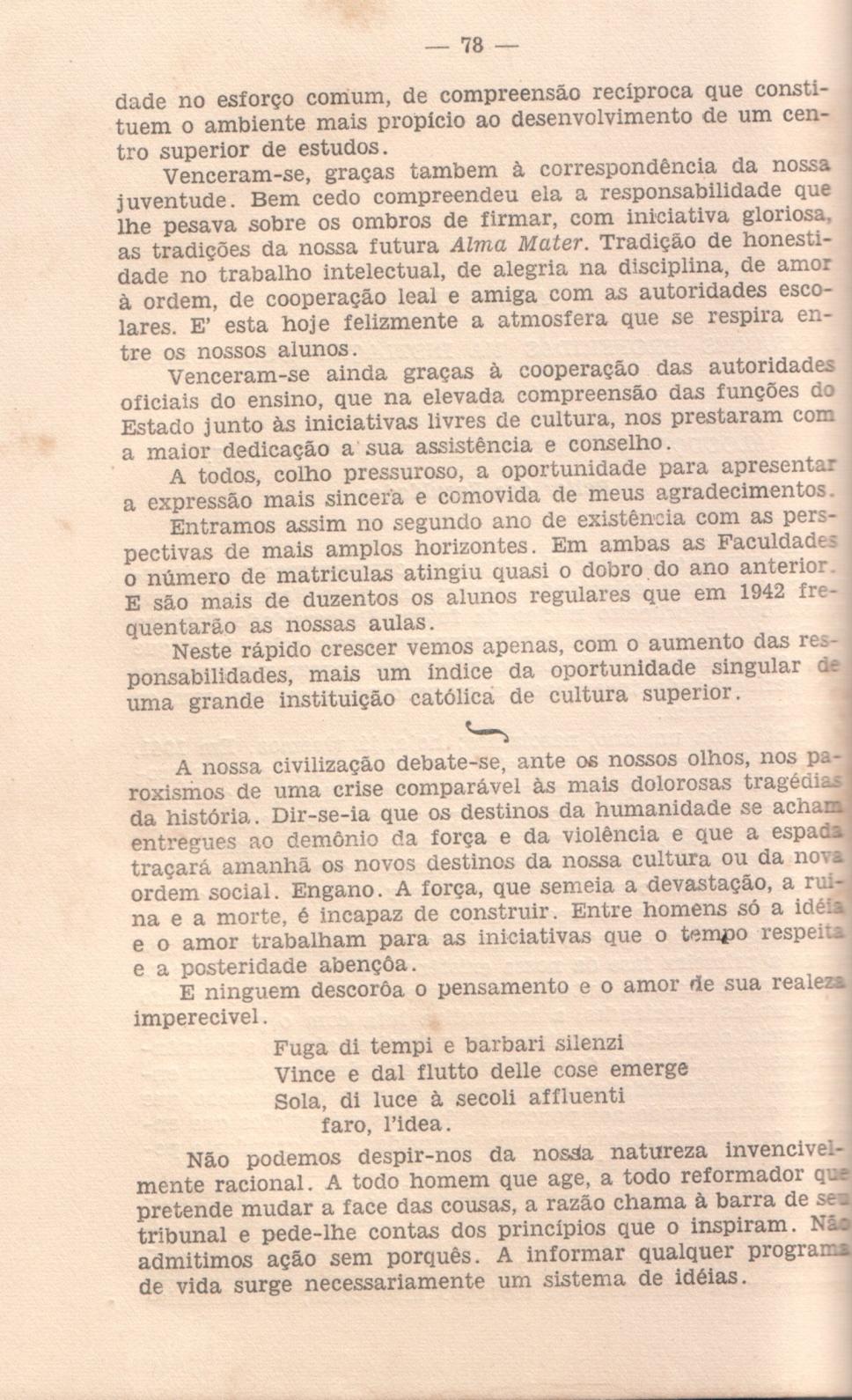 Alocução proferida na instalação dos cursos pelo Pe. Leonel Franca S.J., Reitor das Faculdades Católicas. "Tradição de honestidade no trabalho intelectual, de alegria na disciplina, de amor à ordem, de cooperação leal e amiga com as autoridades escolares."
