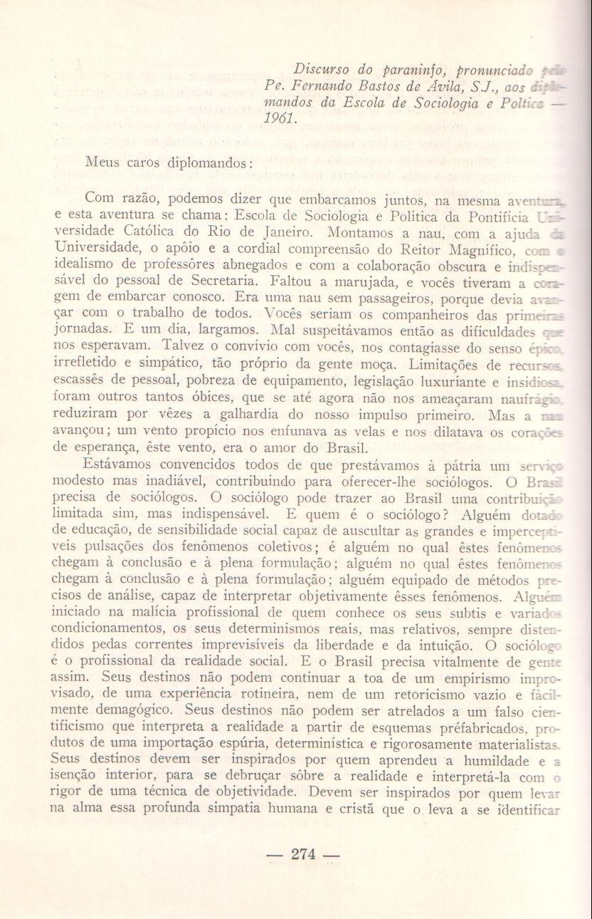 Início do discurso de paraninfo pronunciado pelo Pe. Fernando Bastos de Ávila, S. J. aos diplomandos de Sociologia e Política.