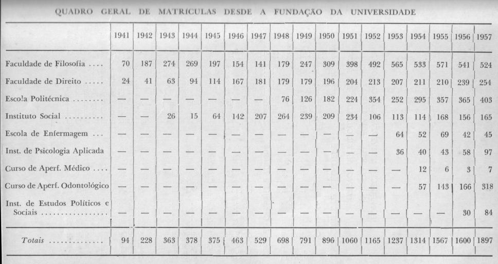 Quadro geral de matrículas desde a fundação da Universidade, pág. 23 do Anuário PUC-Rio 1957.
