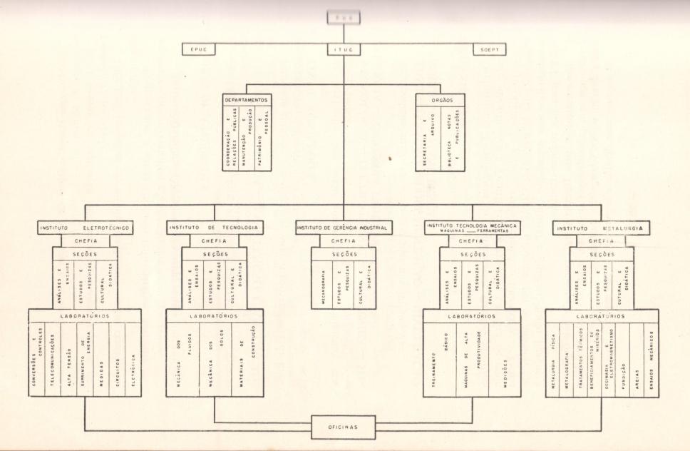 Organograma do ITUC - Instituto Tecnológico da Universidade Católica, que, naquele momento, incluía cinco institutos: o Instituto Eletrotécnico, o Instituto de Tecnologia, o Instituto de Gerência Industrial, o Instituto Tecnologia Mecânica (Máquinas - Ferramentas) e o Instituto Metalurgia.