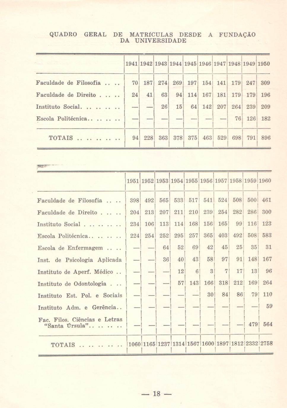 Quadro Geral de Matrículas desde a fundação da Universidade até 1960.