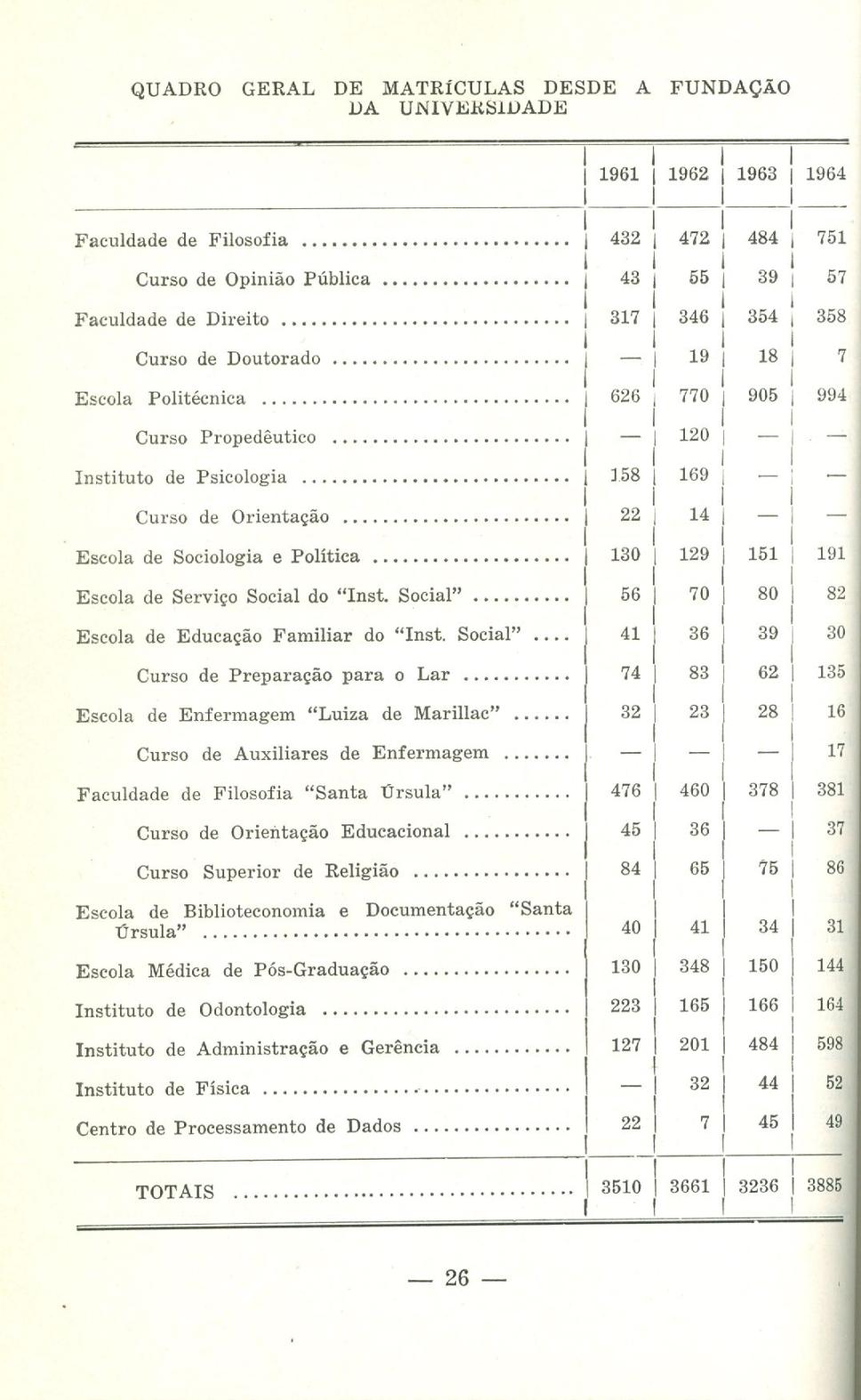 Quadro geral de matriculas desde a fundação da Universidade, incluindo os que foram integrados da Universidade Santa Úrsula.