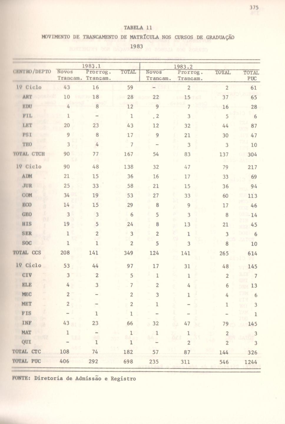 Coleção Anuário da Pontifícia Universidade Católica do Rio de Janeiro 1983 Código exclusivo eg0065_025 Data da criação Ano 1983 Data de criação Sáb, 01/01/1983 - 12:00 Natureza do documento imagem Referente a Reitoria Identificação Original Anuário da PUC-Rio - 1983 - p. 375 Descrição Tabela 11 - Movimento de matrícula nos Cursos de Graduação 1983.