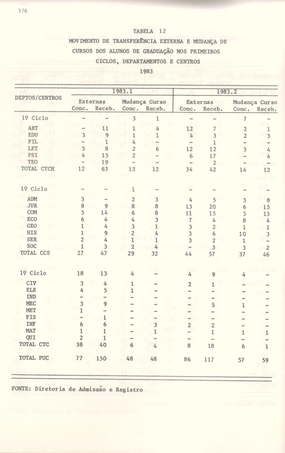 Coleção Anuário da Pontifícia Universidade Católica do Rio de Janeiro 1983 Código exclusivo eg0065_026 Data da criação Ano 1983 Data de criação Sáb, 01/01/1983 - 12:00 Natureza do documento imagem Referente a Reitoria Identificação Original Anuário da PUC-Rio - 1983 - p. 376 Descrição Tabela 12 - Movimento de transferência externa e mudança de Curso dos alunos de Graduação nos primeiros Ciclos, Departamentos e Centros 1983.
