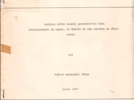 eg0066_001 | 7/1967 | Capa da primeira dissertação de Mestrado defendida no Programa de Pós-graduação em Engenharia de Produção: Escolha entre planos alternativos para processamento de dados, no âmbito de uma empresa de médio porte, por Flávio Magalhães Véras. |