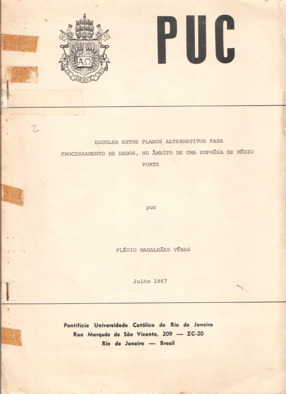 Capa da primeira dissertação de Mestrado defendida no Programa de Pós-graduação em Engenharia de Produção: Escolha entre planos alternativos para processamento de dados, no âmbito de uma empresa de médio porte, por Flávio Magalhães Véras.
