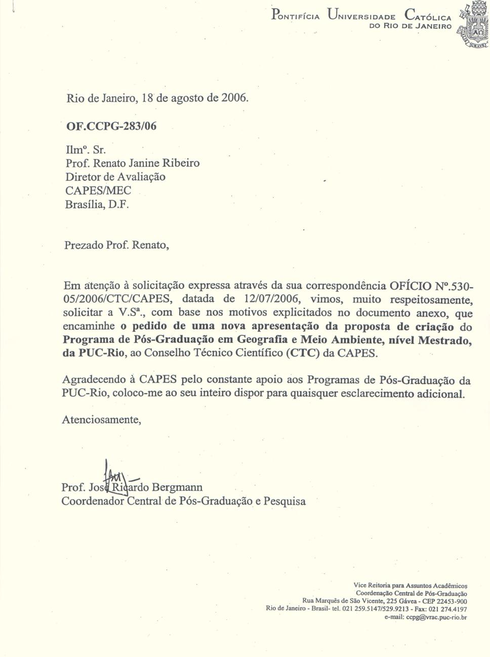 Ofício do Coordenador da CCPG ao Diretor de Avaliação da Capes, prof. Renato Janine Ribeiro, sobre a proposta de criação do Mestrado em Geografia e Meio Ambiente.