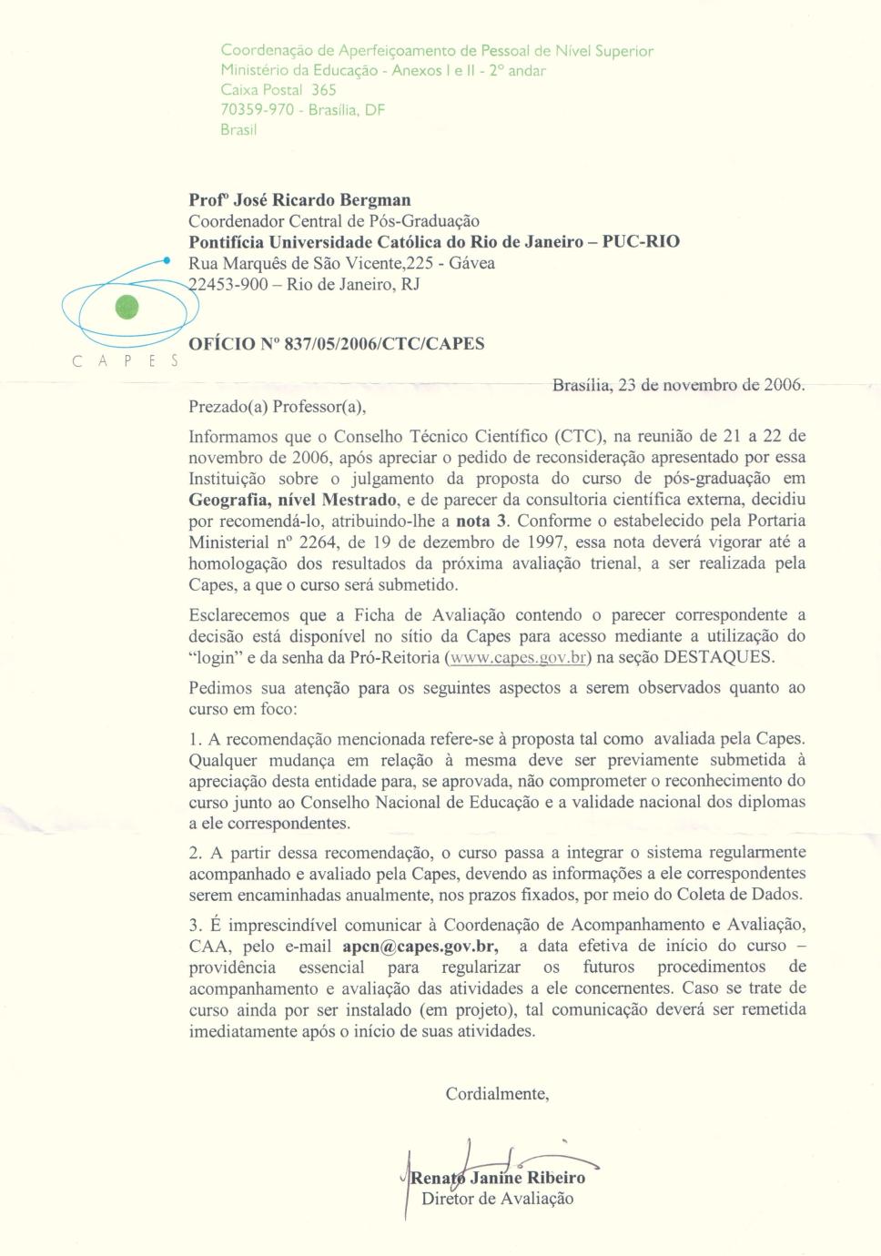 Ofício do diretor de avaliação da Capes, prof. Renato Janine Ribeiro, endereçado ao prof. Bergmann, Coordenador Central de Pós-graduação da PUC-Rio, autorizando com condicionantes o funcionamento Mestrado em Geografia.