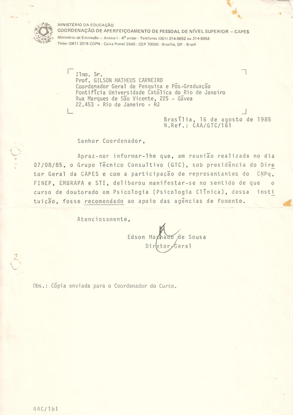 Carta do diretor geral da CAPES informando sobre a recomendação de apoio ao Doutorado em Psicologia pelas agências de fomento à pós-graduação.