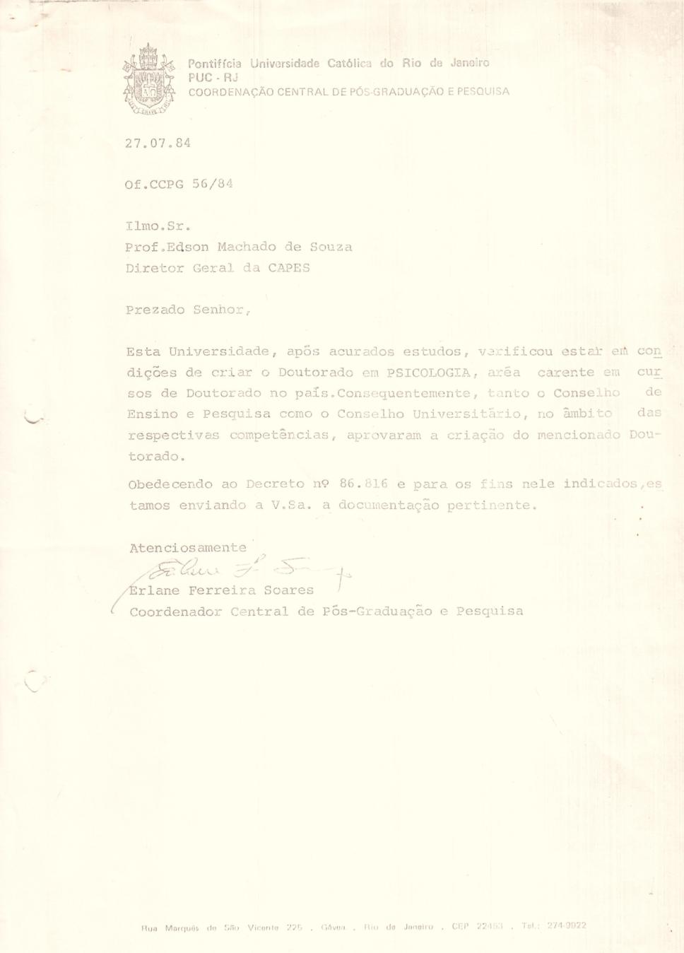 Comunica ao Diretor Geral da CAPES, prof. Edson Machado de Souza, a criação do Doutorado em Psicologia.