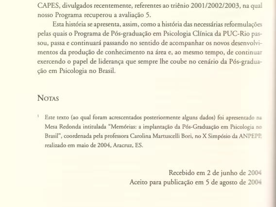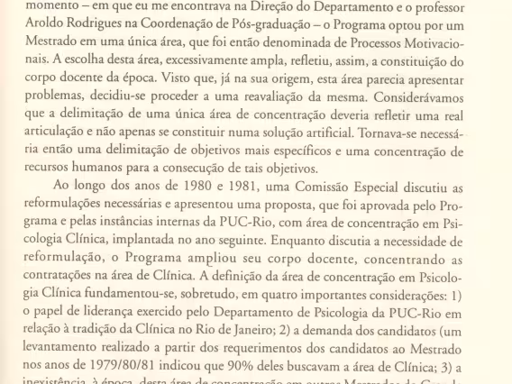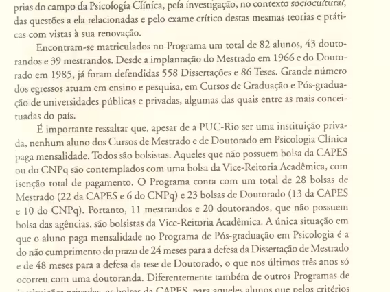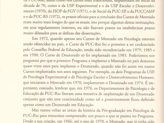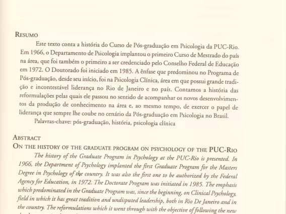 eg0072_001 | 2004 | Contando a História do Curso de Pós-Graduação em Psicologia da PUC-Rio.Resumo: "Este texto conta a história do Curso de Pós-graduação em Psicologia da PUC-Rio. Em 1966, o Departamento de Psicologia implantou o primeiro Curso de Mestrado do país na área, que foi também o primeiro a ser credenciado pelo Conselho Federal de Educação em 1972. O Doutorado foi iniciado em 1985. A ênfase que predominou no Programa de Pós-graduação, desde seu início, foi na Psicologia Clínica, área em que possui grande tradição e incontestável liderança no Rio de Janeiro e no país. Contamos a história das reformulações pelas quais ele passou no sentido de acompanhar os novos desenvolvimentos da produção de conhecimento na área e, ao mesmo tempo, de exercer o papel de liderança que sempre lhe coube no cenário da Pós-graduação em Psicologia no Brasil." |