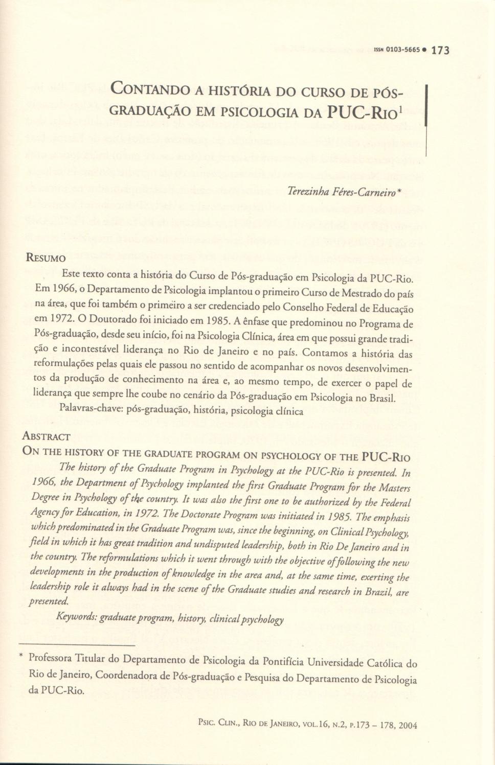 Contando a História do Curso de Pós-Graduação em Psicologia da PUC-Rio.Resumo: "Este texto conta a história do Curso de Pós-graduação em Psicologia da PUC-Rio. Em 1966, o Departamento de Psicologia implantou o primeiro Curso de Mestrado do país na área, que foi também o primeiro a ser credenciado pelo Conselho Federal de Educação em 1972. O Doutorado foi iniciado em 1985. A ênfase que predominou no Programa de Pós-graduação, desde seu início, foi na Psicologia Clínica, área em que possui grande tradição e incontestável liderança no Rio de Janeiro e no país. Contamos a história das reformulações pelas quais ele passou no sentido de acompanhar os novos desenvolvimentos da produção de conhecimento na área e, ao mesmo tempo, de exercer o papel de liderança que sempre lhe coube no cenário da Pós-graduação em Psicologia no Brasil."