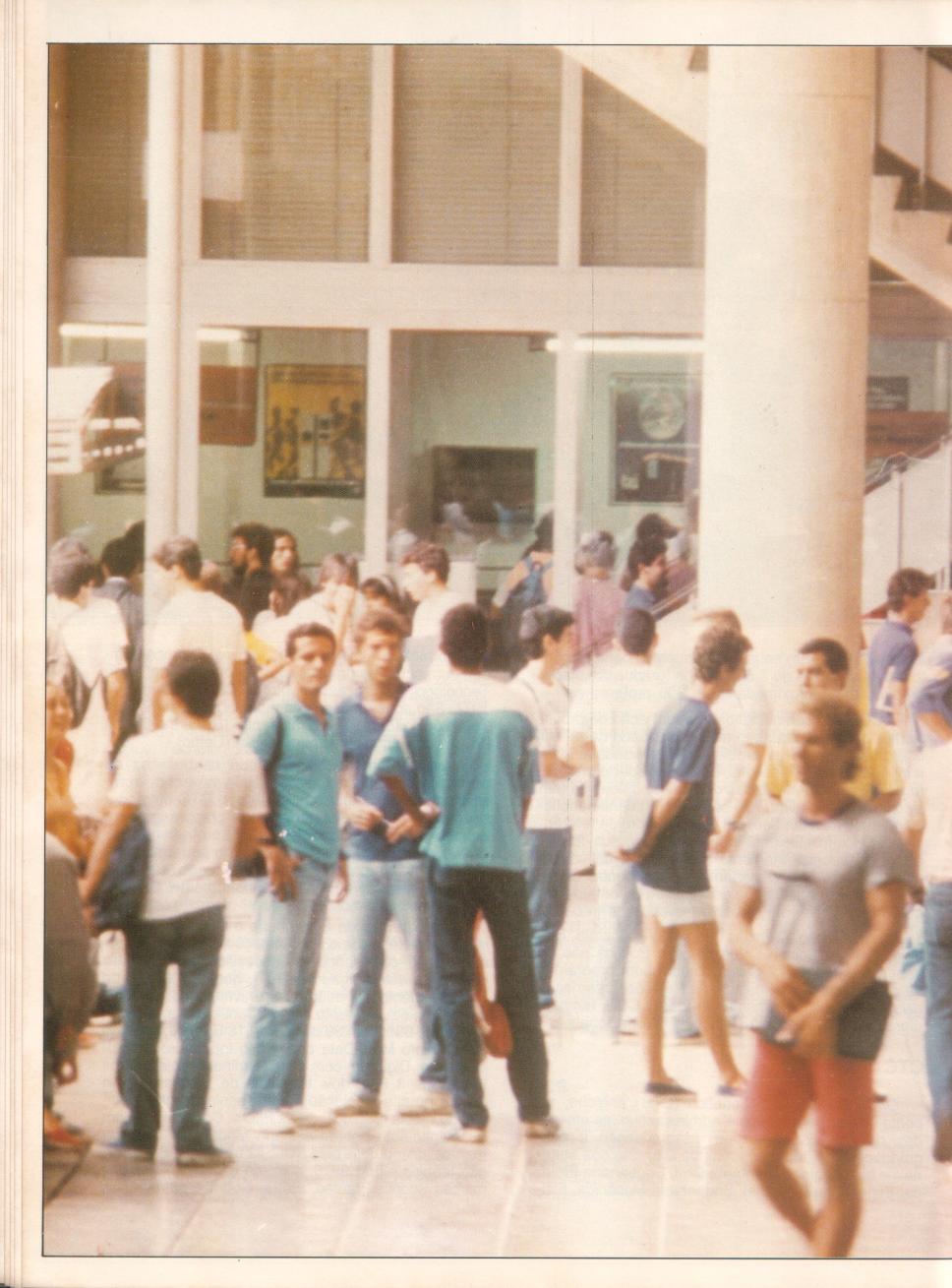Pessoas circulam nos pilotis, próximo ao banco.