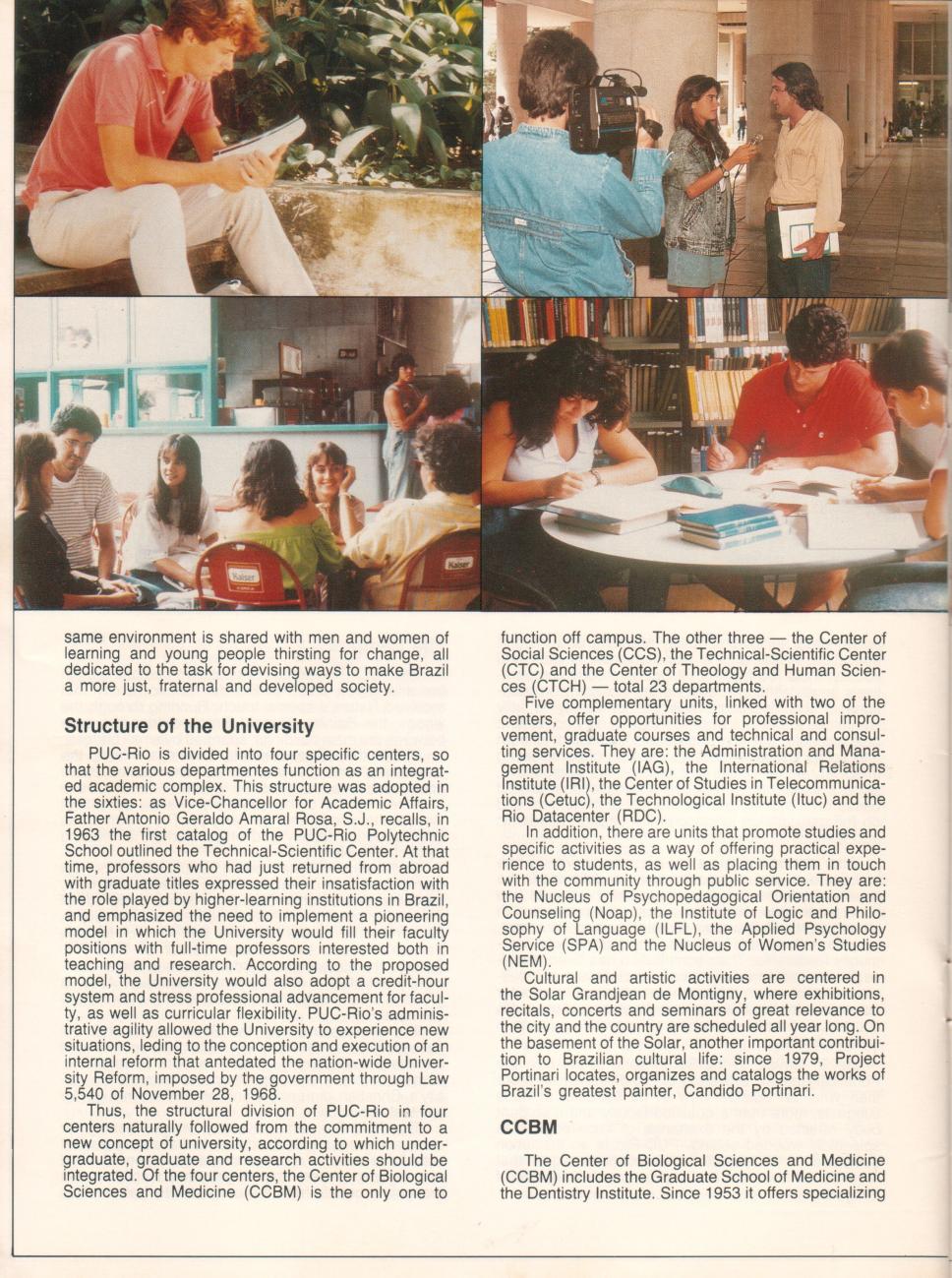 Texto "Structure of the University", em inglês. Fotos dos pilotis do Edifício da Amizade, do Bar das Freiras e de alunos em biblioteca.