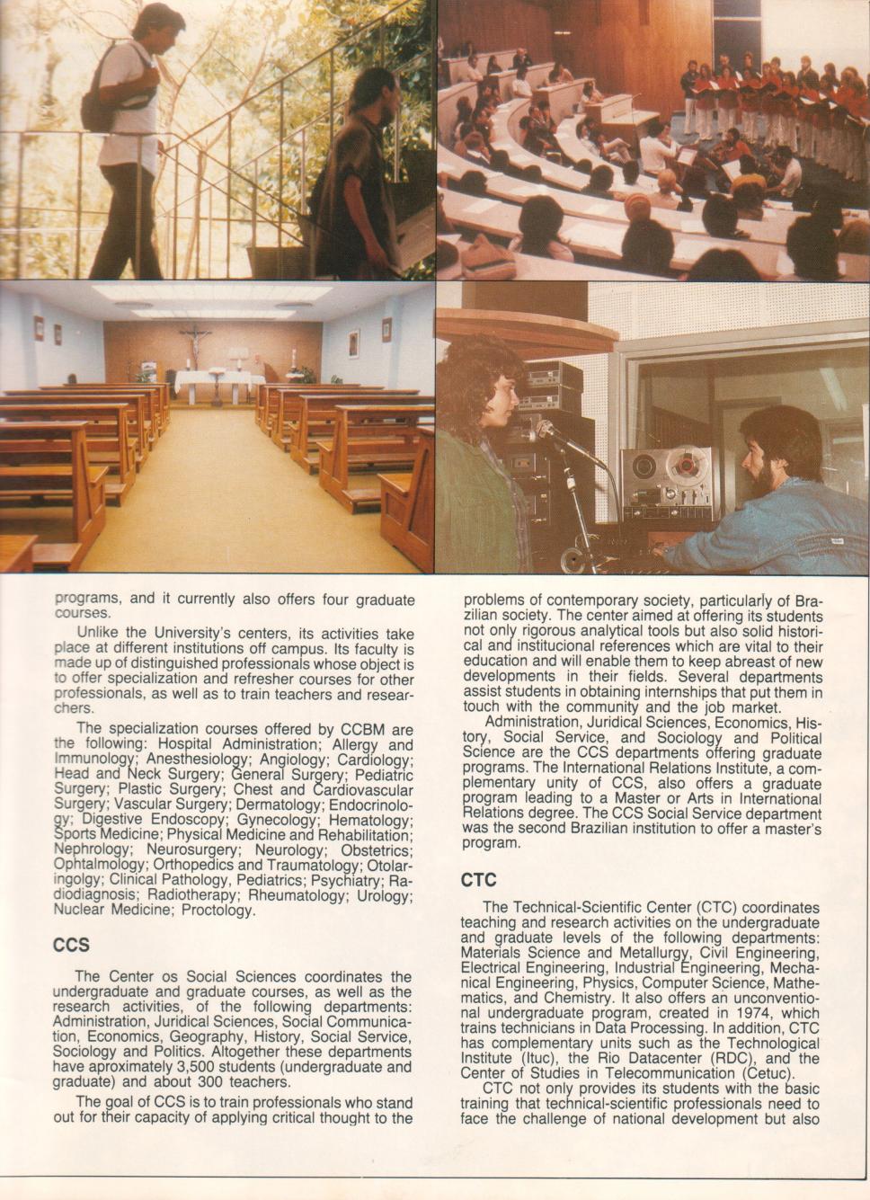 Informaçõe em inglês sobre o CCS / CTC. Fotos do Coral da PUC-Rio no auditório do RDC, antiga capela e um estúdio de rádio do Departamento de Comunicação.
