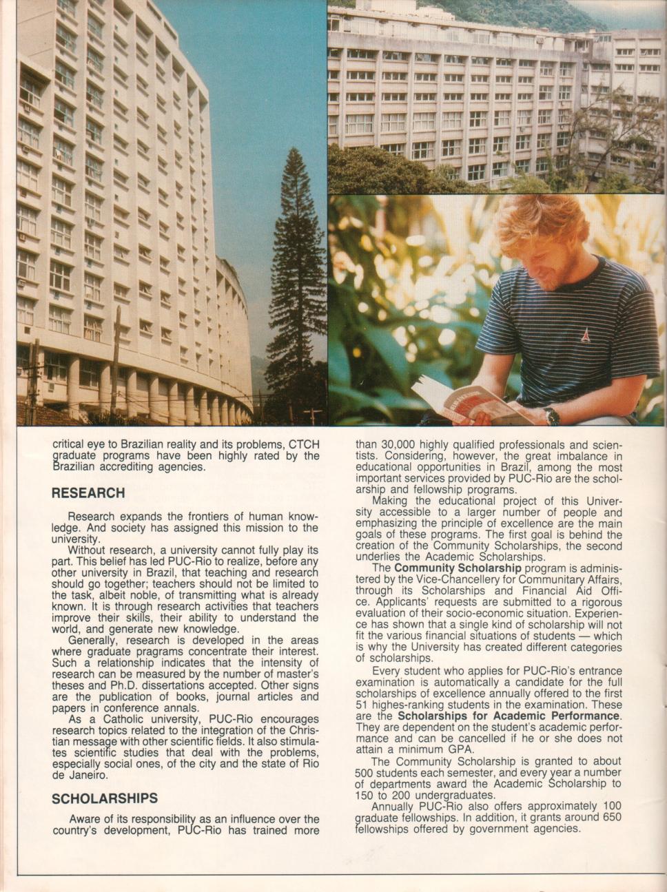 Informações sobre Research e Scholarships, em inglês. Fotos dos edifícios Cardeal Leme e da Amizade.