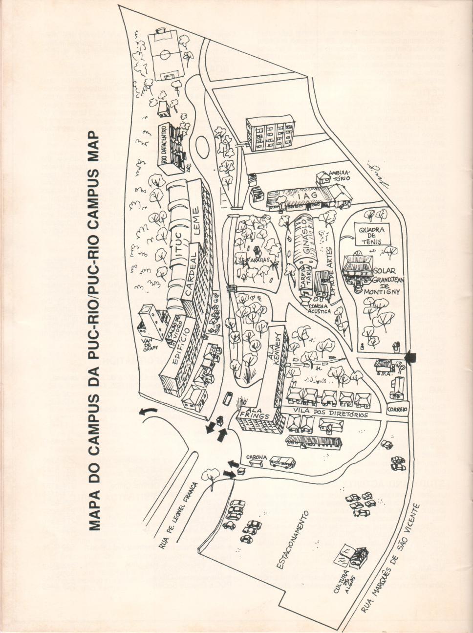 Mapa esquemático do campus Gávea. Mostra os locais do Salão de Vidro, do ponto de carona, da quadra de tênis, do antigo ambulatório, entre outros.