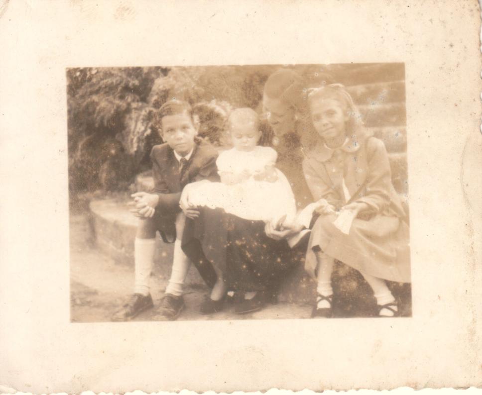 Mãe de Maria José, Maria José e seus dois irmãos sentados na escadaria do Solar.