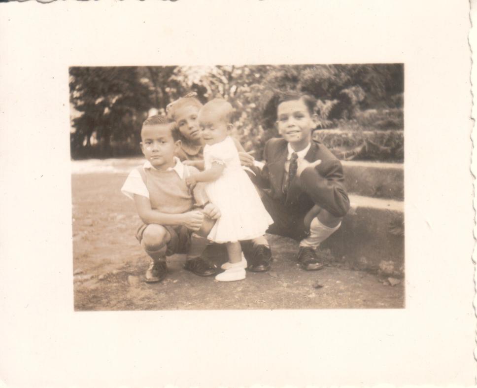 Maria José e seus irmãos sentados na escadaria.