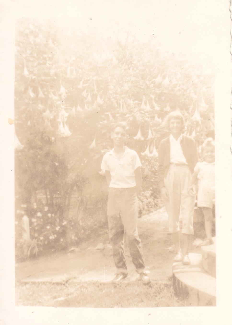 João, Beatriz e Maria José na frente da escadaria do Solar.