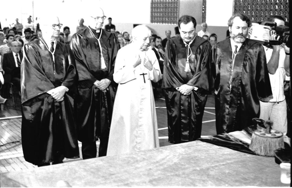 Da esq. para dir.: prof. pe. Antonio Geraldo Amaral Rosa S.J. (Vice-reitor para Assuntos Acadêmicos), prof. pe. Amarilho Checon S.J. (Vice-Reitor para Assuntos Comunitários), dom Helder Pessoa Camara, prof. Luiz Roberto Azevedo Cunha (ECO), prof. Humberto Siqueira Brandi (FIS)