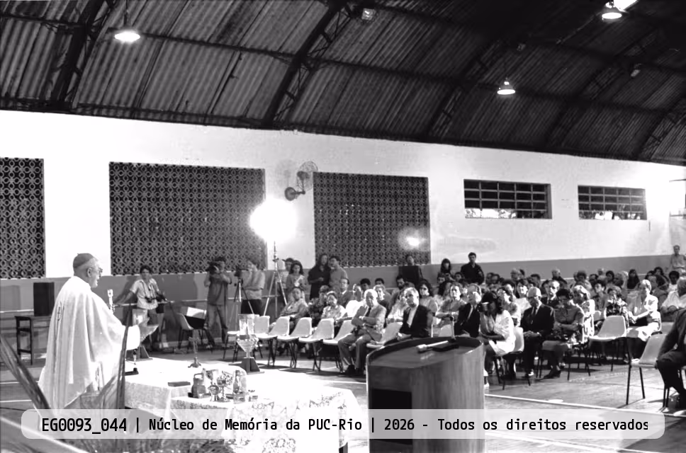 Cerimônia religiosa com Dom Eugênio Sales no Ginásio da PUC-Rio, cruz, microfone.