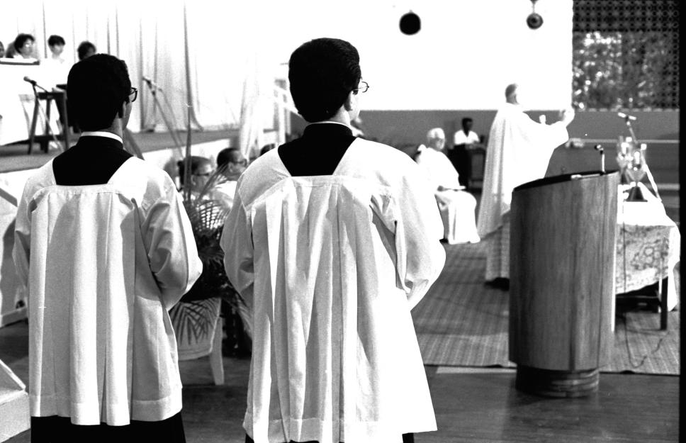 Cerimônia religiosa com Dom Eugênio Sales no Ginásio da PUC-Rio, cruz, coral.