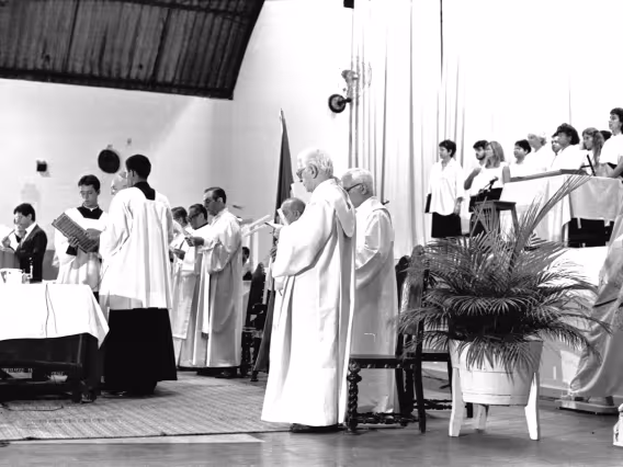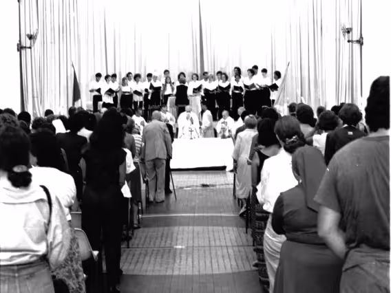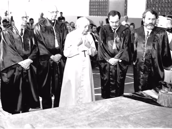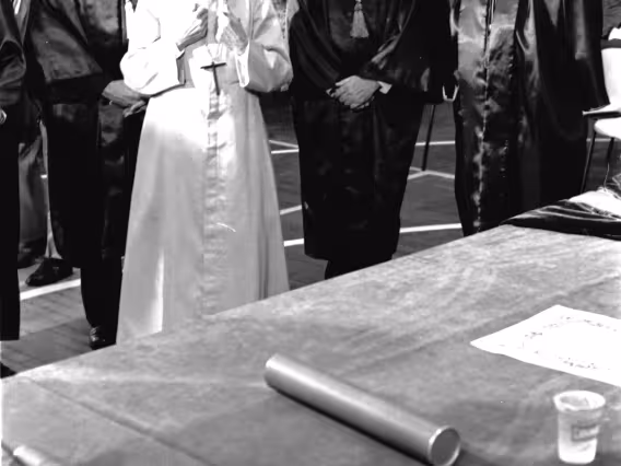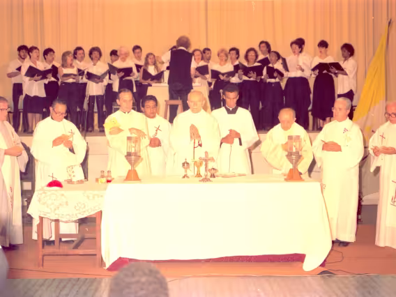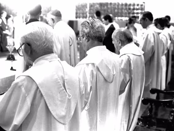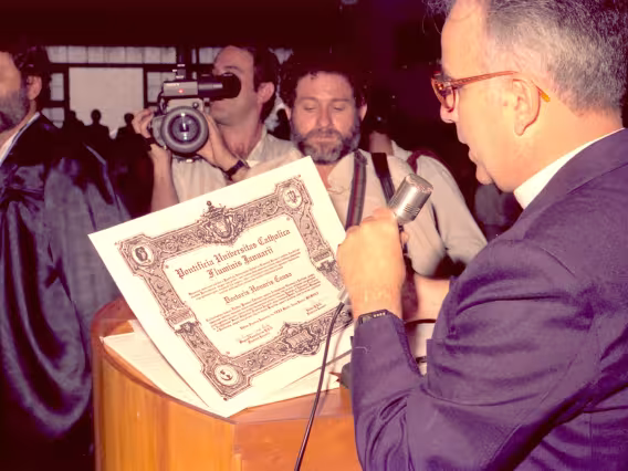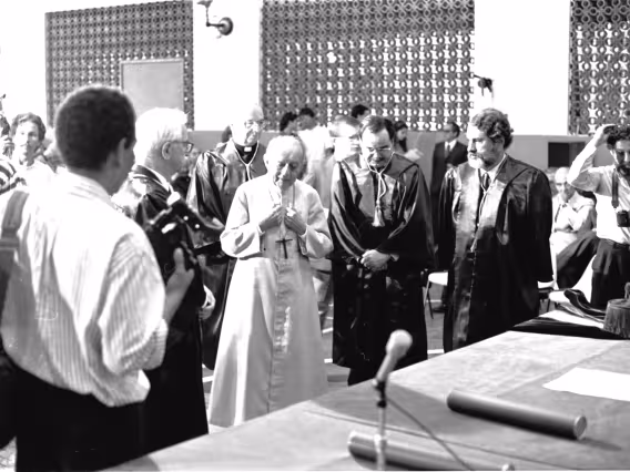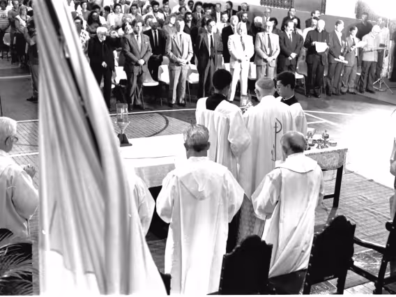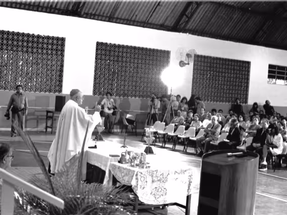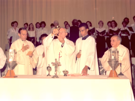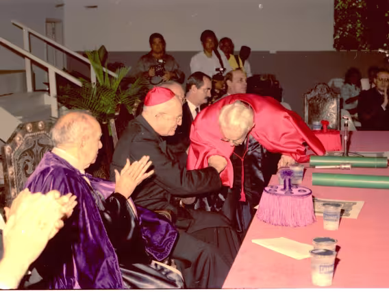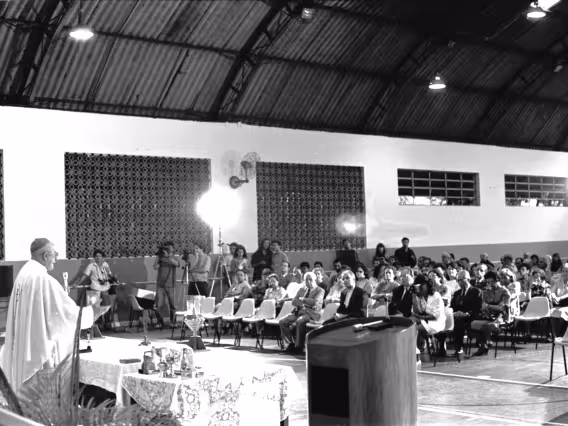 Série de fotografias digitalizadas do acervo de negativos em preto e branco do Projeto Comunicar e de slides coloridos do acervo da Reitoria da PUC-Rio. As imagem registram a Missa de Ação de Graças em homenagem aos 50 anos da PUC-Rio, celebrada pelo cardeal arcebispo do Rio de Janeiro e Grão-Chanceler da PUC-Rio, dom Eugênio Sales, e a cerimônia que concedeu o título de Doutor Honoris Causa ao padre Dom Helder Camara e ao advogado Sobral Pinto.