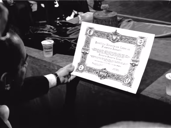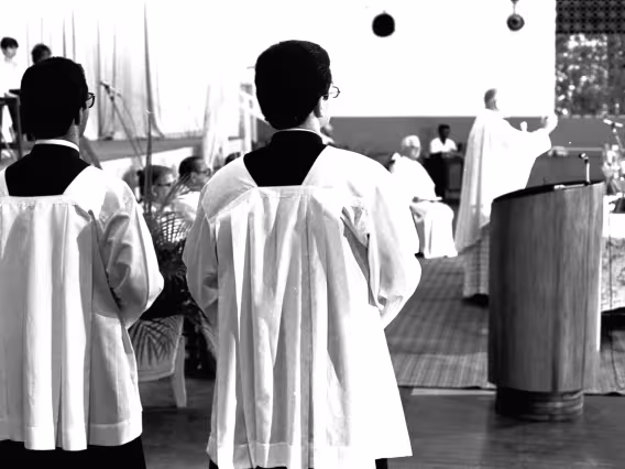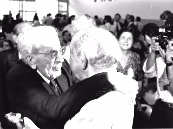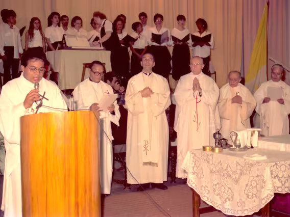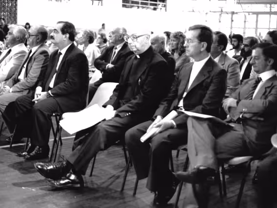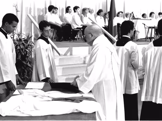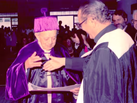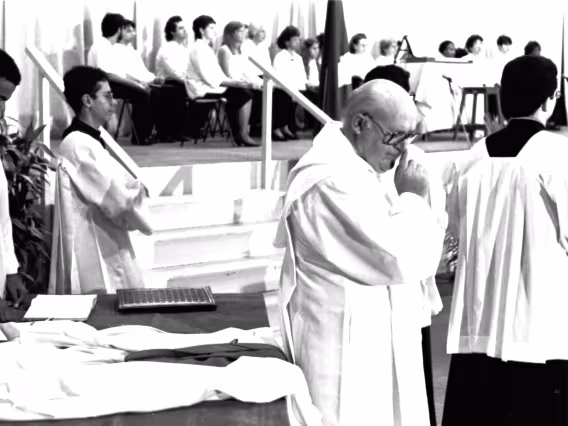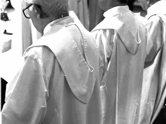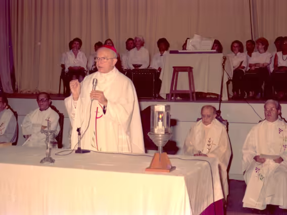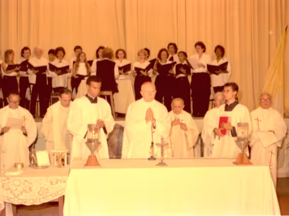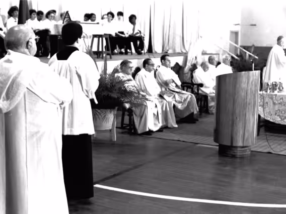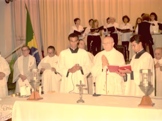 Série de fotografias digitalizadas do acervo de negativos em preto e branco do Projeto Comunicar e de slides coloridos do acervo da Reitoria da PUC-Rio. As imagem registram a Missa de Ação de Graças em homenagem aos 50 anos da PUC-Rio, celebrada pelo cardeal arcebispo do Rio de Janeiro e Grão-Chanceler da PUC-Rio, dom Eugênio Sales, e a cerimônia que concedeu o título de Doutor Honoris Causa ao padre Dom Helder Camara e ao advogado Sobral Pinto.