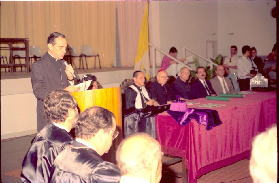 Cerimônia nas comemorações dos 50 anos da PUC-Rio, na qual foi concedido o título de Doutor Honoris Causa a Sobral Pinto e a Dom Helder Camara.